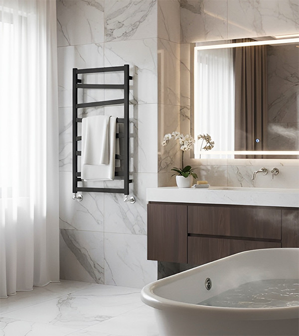Современный и стильный водяной полотенцесушитель ZIG 858x500 мм с нижним подключением SX в цвете Soft 9005. Компактный размер делает его идеальным для небольших ванных комнат, при этом обеспечивая эффективное отопление.