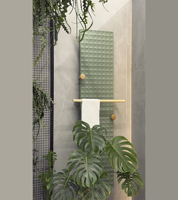 Радиатор выполнен из 100% перерабатываемого литого алюминия и отличается выразительной трёхмерной геометрической поверхностью. Его фактура формирует сильный визуальный акцент и делает Waffle полноценным элементом интерьера, а не просто техническим устройством.