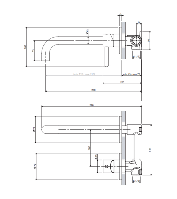 - Distanța robinetului de suprafața plăcii de faianță: 19-21,5 cm (în funcție de adâncimea instalării robinetului în perete)
