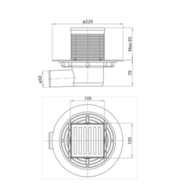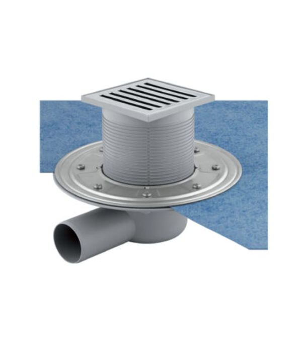 Kit de sifon pentru rigolă de pardoseală complet inspectabil. Include membrană de izolație predecupată 500×500 mm, grătar design 105×105 mm, grosime 5 mm, model „Linea”. Evacuare laterală ø 50 mm.