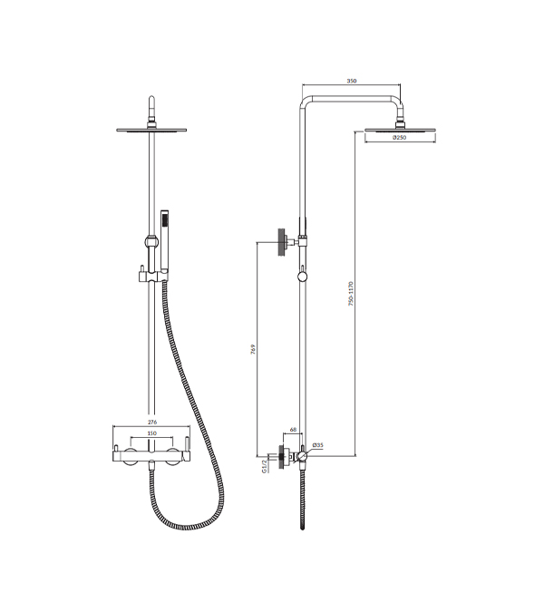 - Cap de duș superior din alamă, dimensiuni: ø25 cm, distanța față de perete: 42 cm