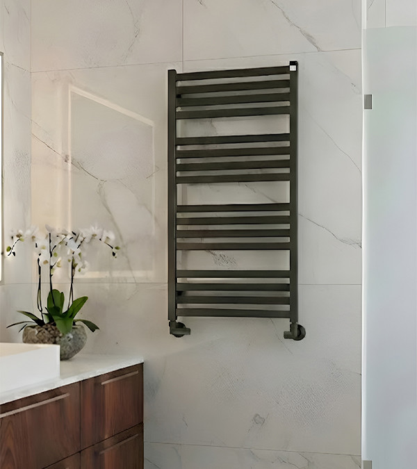 Designul eficient al suportului încălzit pentru prosoape subliniază forma sa îngrijită și se integrează perfect în interioarele bucătăriilor și băilor.